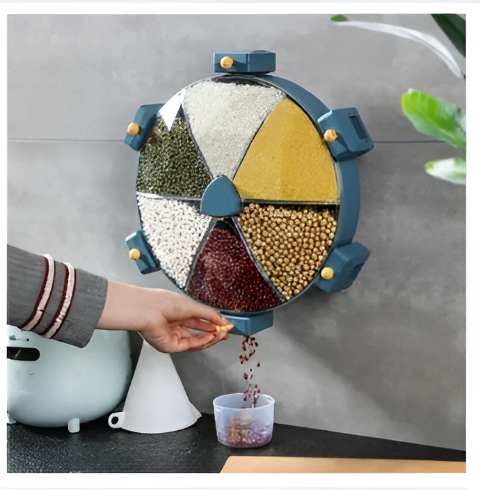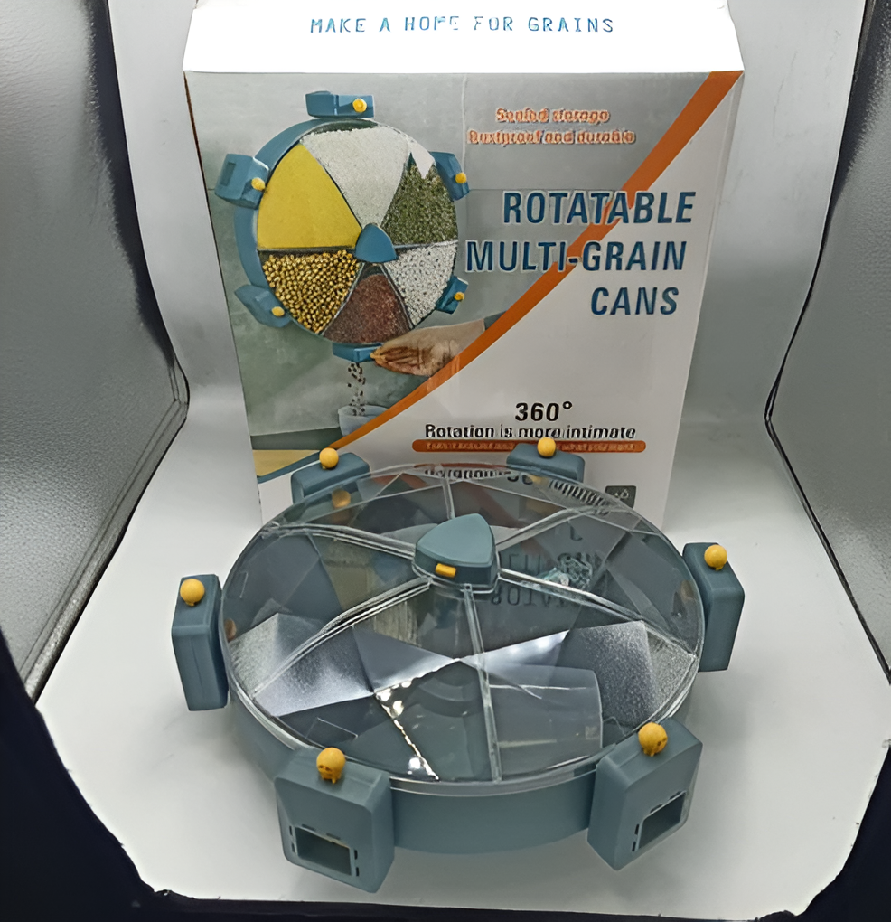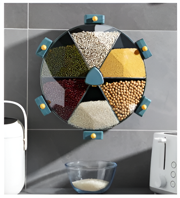يتميز الصندوق بتصميم دوار يحتوي على سبع أقسام شفافة، مما يتيح لك تخزين مجموعة متنوعة من الحبوب والأطعمة الجافة بشكل منظم وسهل الوصول.
