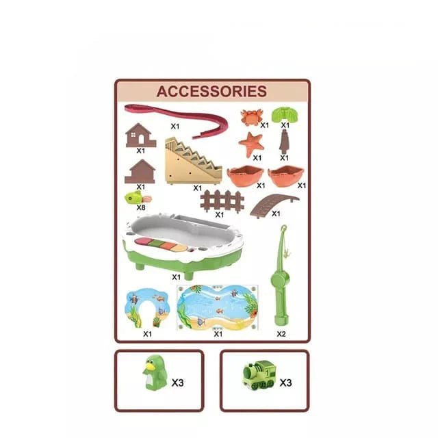 مجموعة صيد الاسماك تجمع بين اللعب التفاعلي والتعليم الحسي في تصميم ممتع ومليء بالألوان، كما أنها مزودة بحوض صغير يحتوي على أسماك متحركة وأزرار موسيقية تضيف لمسة من المرح أثناء الصيد.