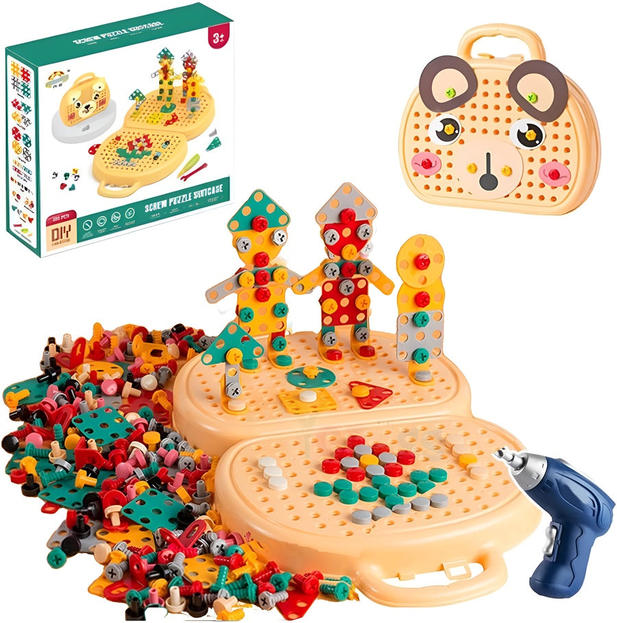 دريل الفك والتركيب 203 قطعة يجمع بين التعليم العملي والتسلية في تصميم مبتكر ومتكامل، كما أنه مزود بمثقاب كهربائي آمن للأطفال يُستخدم لتثبيت وفك القطع بسهولة.