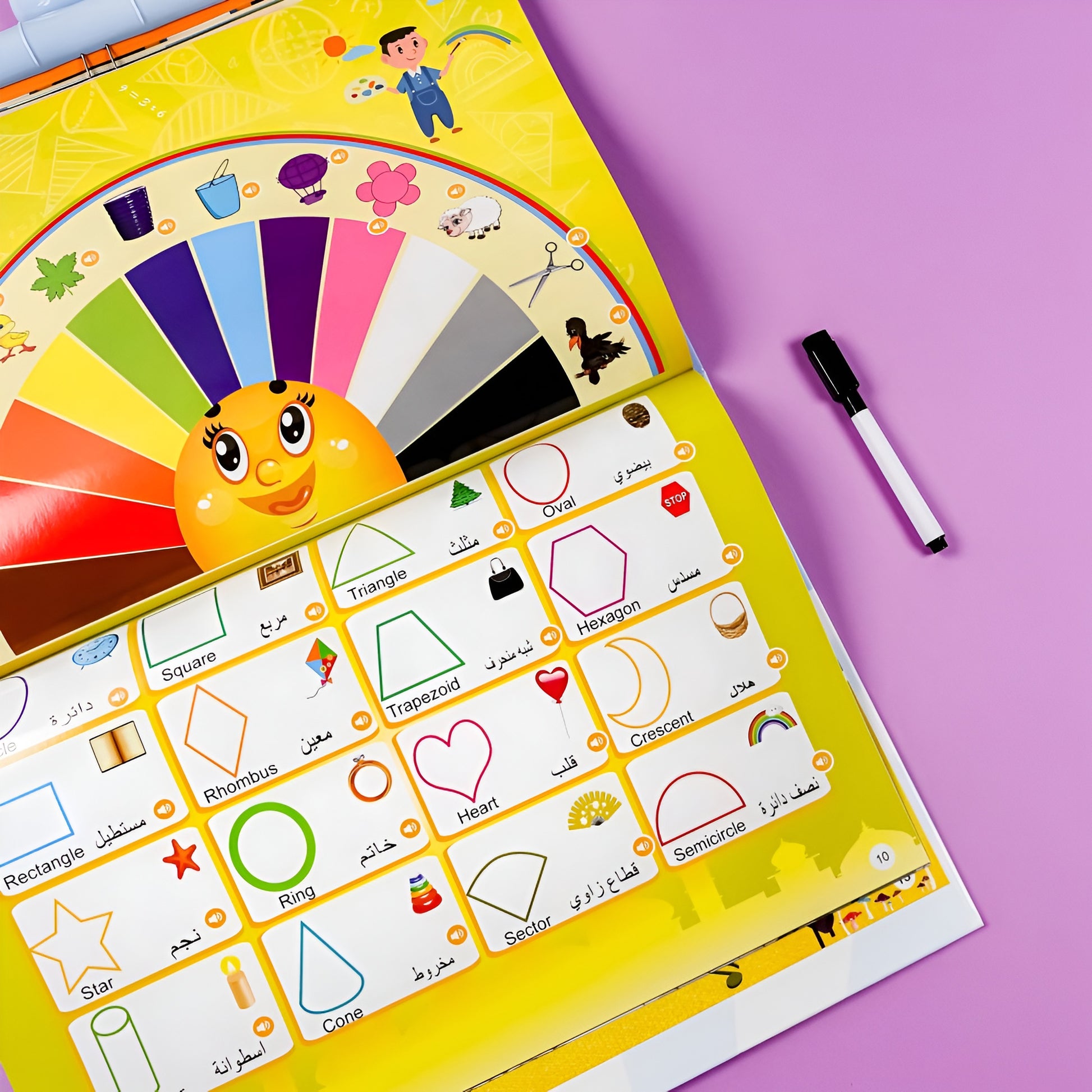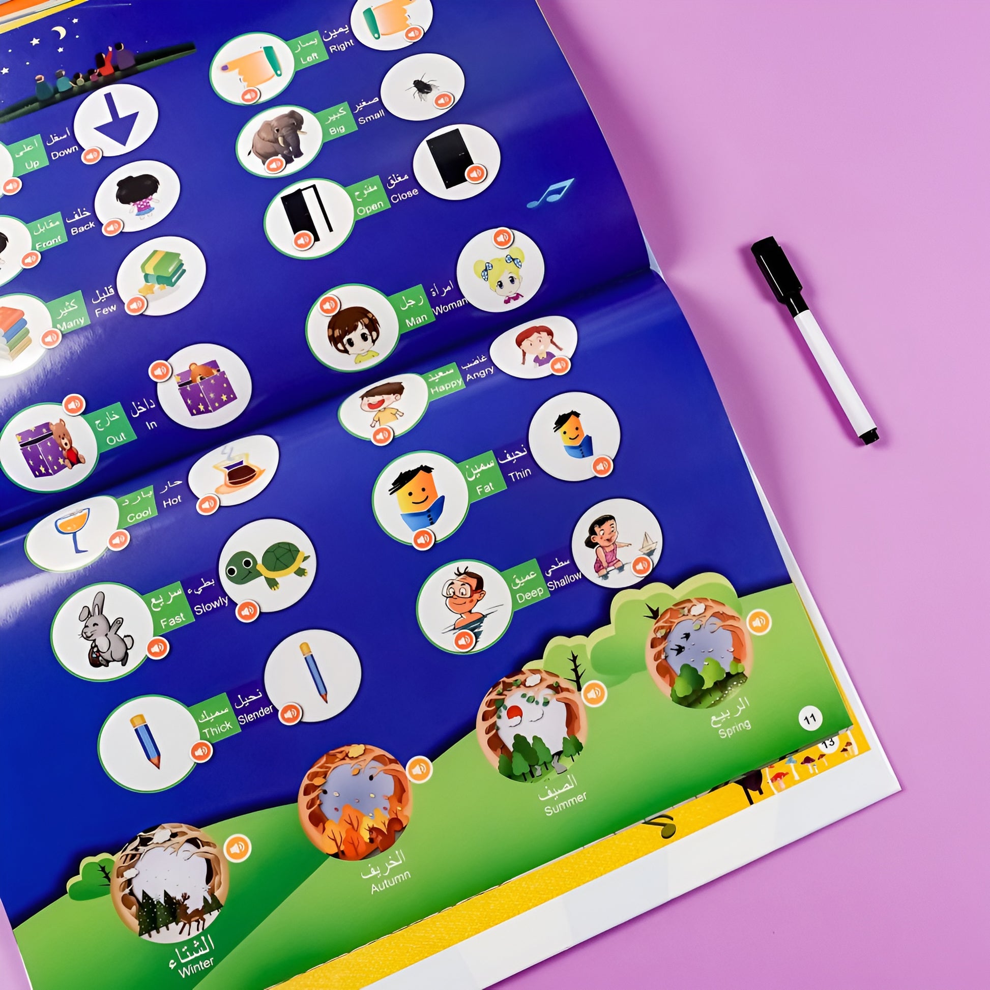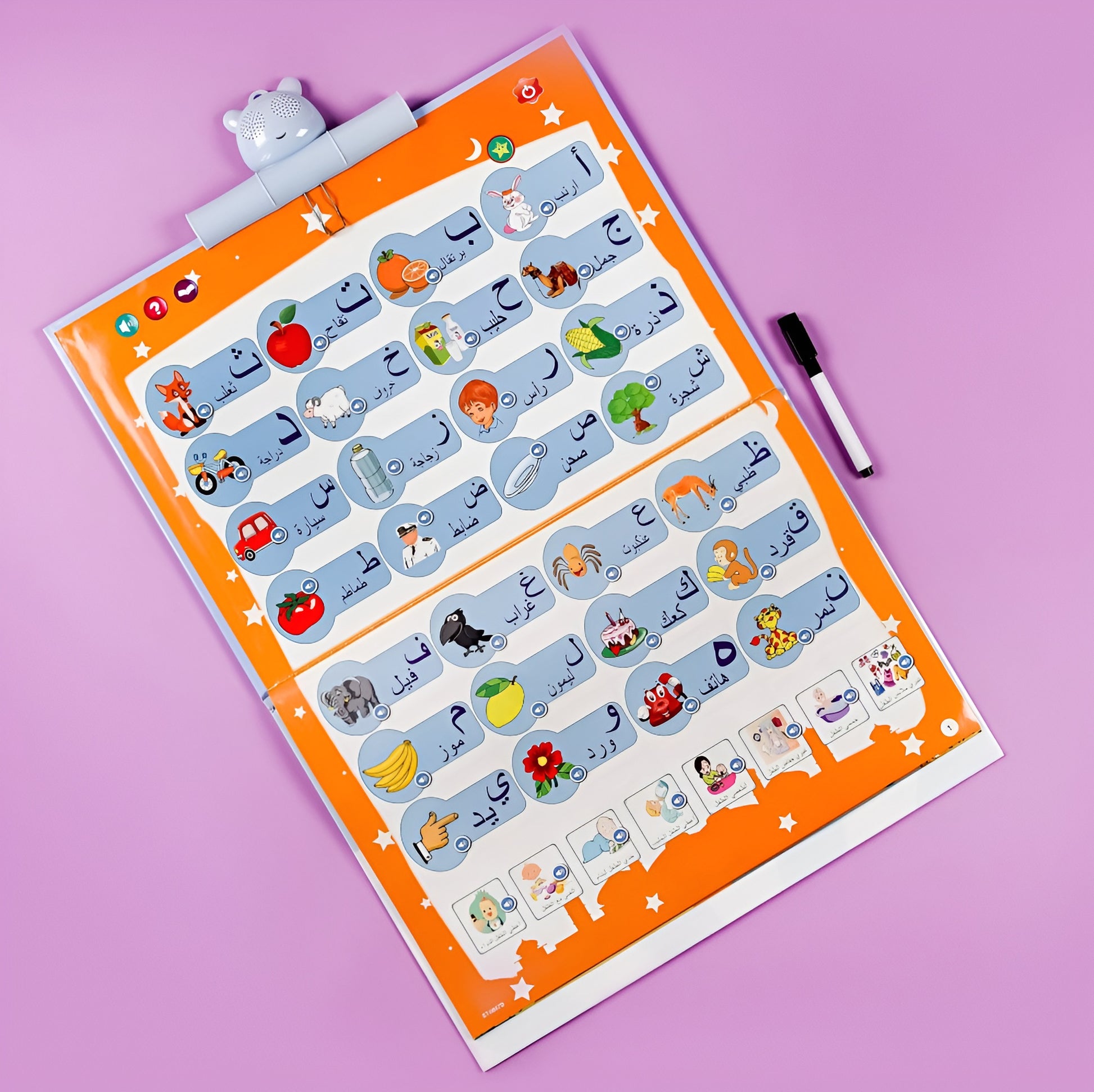 يتميز الكتاب بأنه ناطق تفاعلي لتعليم الحروف والكلمات العربية والإنجليزية ويشمل أناشيد تعليمية وأصوات حيوانات وأشكال ممتعة تساعد على تحسين النطق وتنمية المهارات السمعية والبصرية