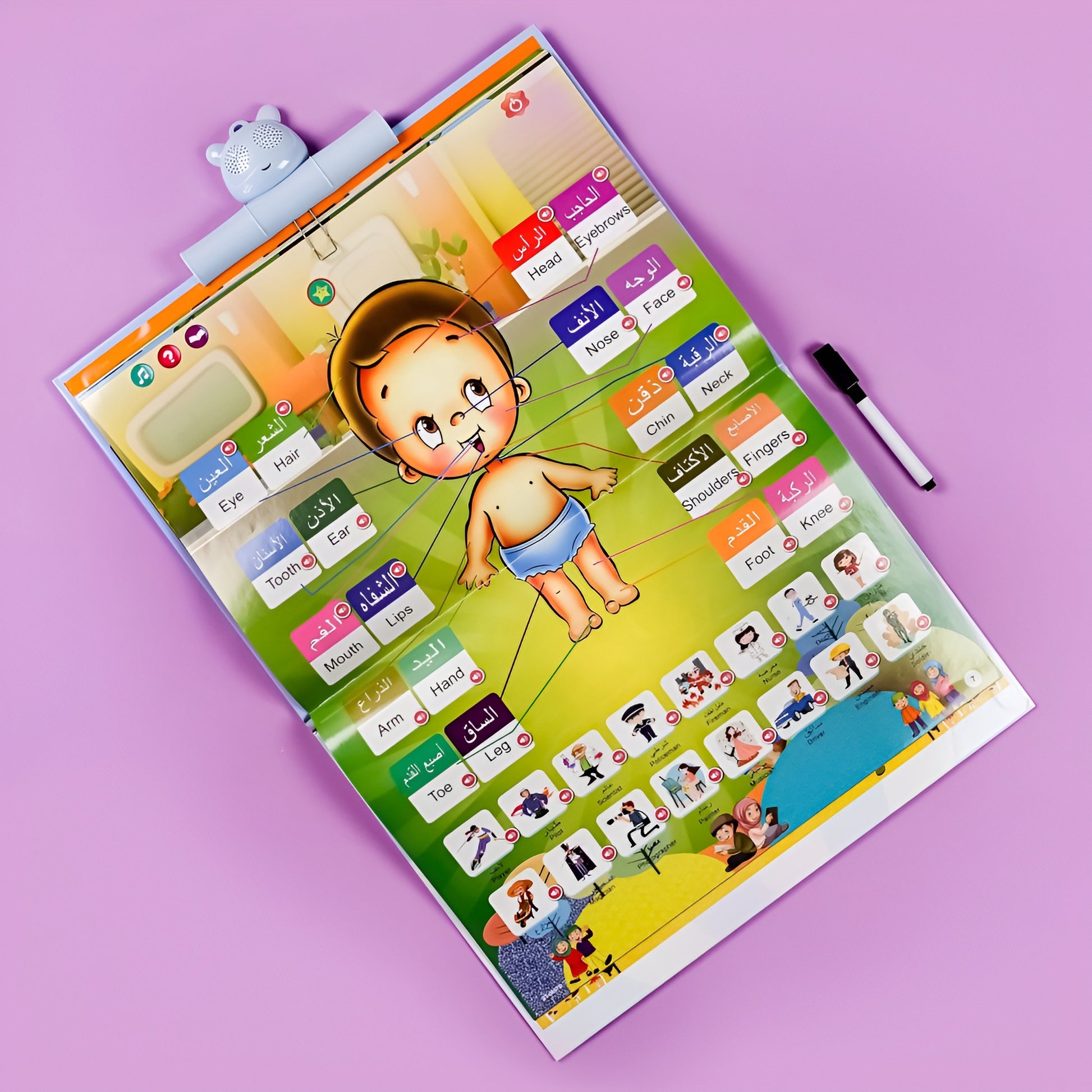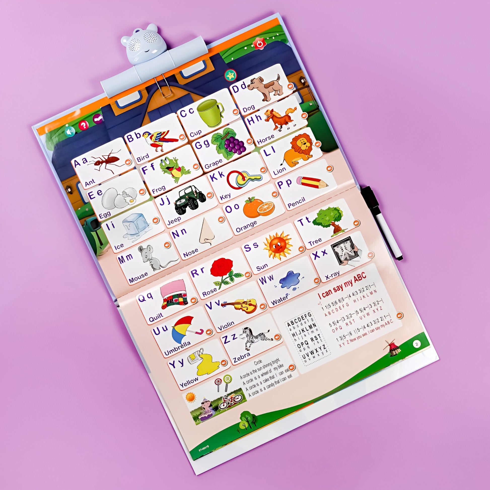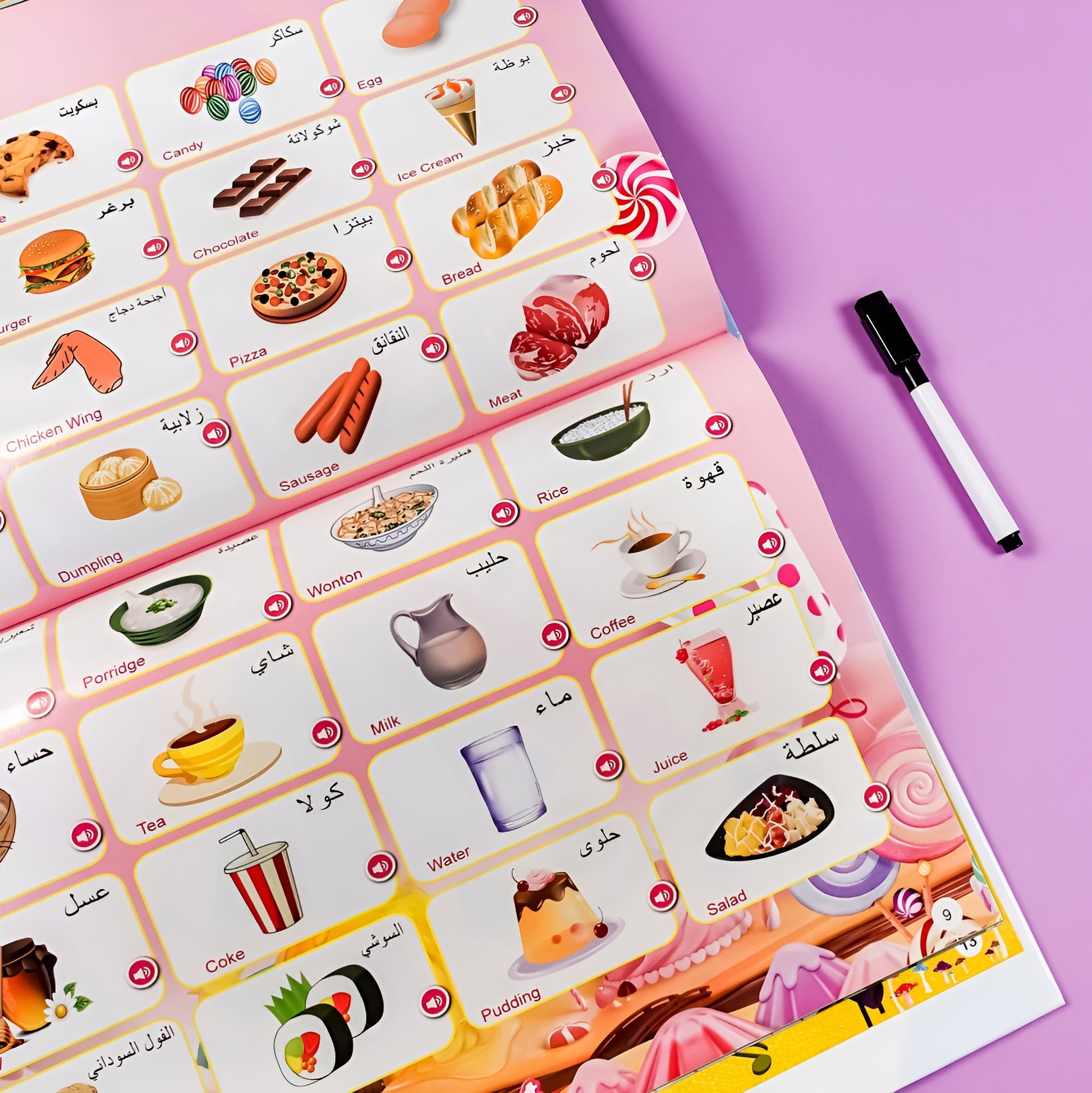 يتميز الكتاب بأنه ناطق تفاعلي لتعليم الحروف والكلمات العربية والإنجليزية ويشمل أناشيد تعليمية وأصوات حيوانات وأشكال ممتعة تساعد على تحسين النطق وتنمية المهارات السمعية والبصرية