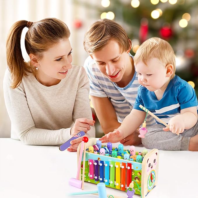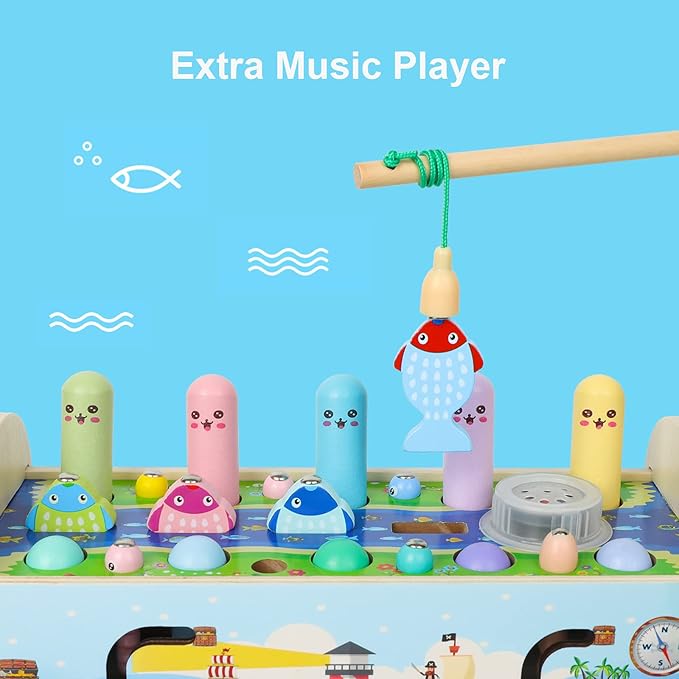 صندوق الانشطة التفاعلي 4 في 1 يجمع بين التعليم والترفيه في تصميم خشبي آمن ومتين، كما أنه مزود ببيانو ملون يعزف نغمات موسيقية بسيطة، مع لعبة صيد الأسماك المغناطيسية التي تنمّي الدقة والانتباه.